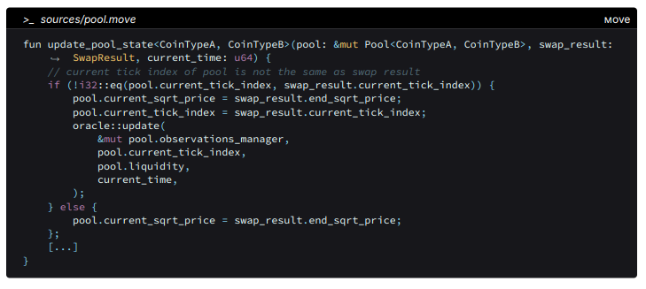 pool::update_pool_state is responsible for updating the state of the liquidity pool after a swap operation occurs. In the current code, oracle::update is called after the pool’s current_tick_index and current_sqrt_price have been updated based on the swap result. This timing will result in the recording of inaccurate and misleading data in the oracle regarding the pool’s state before the swap occurred, rendering the data inconsistent.